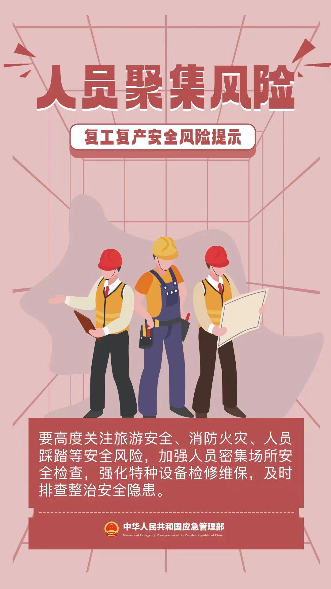 春節(jié)假期結(jié)束,各工程項目陸續(xù)開始復工復產(chǎn),安全防范不可疏忽大意。下面帶領(lǐng)大家來了解并盤點一下關(guān)于復工復產(chǎn)時期的主要危險因素及應(yīng)對辦法。復工復產(chǎn)時期主要危險因素:1.假期綜合征受假期影響,人雖然回到工作崗位了,但思想不集中,這就是“假期綜合征”。其危險之處就在于職工身心疲憊、心情煩躁、精力不集中,很容易