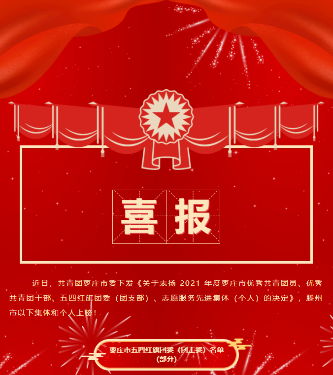 喜報 近日,共青團棗莊市委下發(fā)《關(guān)于表揚 2021 年度棗莊市優(yōu)秀共青團員、優(yōu)秀共青團干部、五四紅旗團委(團支部)、志愿服務(wù)先進(jìn)集體(個人)的決定》,滕州市以下集體和個人上榜!棗莊市五四紅旗團委(團工委)名單(部分)棗莊市五四紅旗團支部(團總支)名單(部分)棗莊市優(yōu)秀共青團員名單(