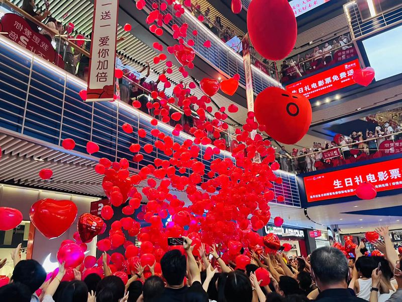 滕投·人和廣場七夕遇見兩周年,一場超級夢幻的氣球雨從天而降,與在場的顧客一起見證了這場浪漫的驚喜。